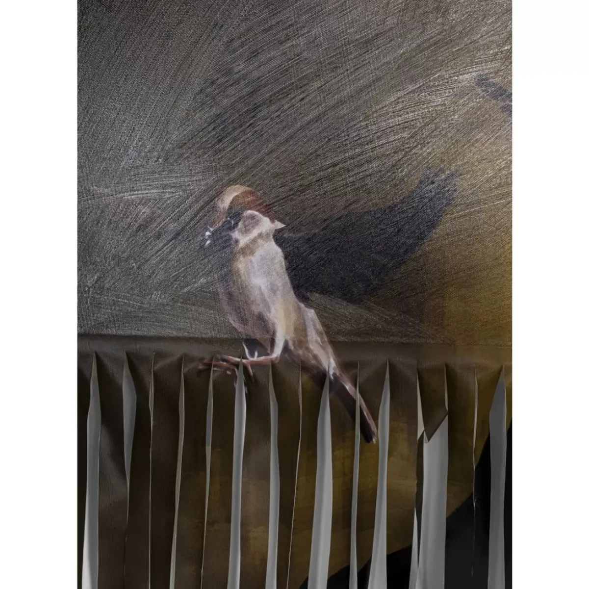 - „Banksy-Style“: Die Leinwand Ist Zur Halfte In Streifen Geschnitten. Aufwendiger Druck Auf Leinwand Im Stil Alter Olgemalde