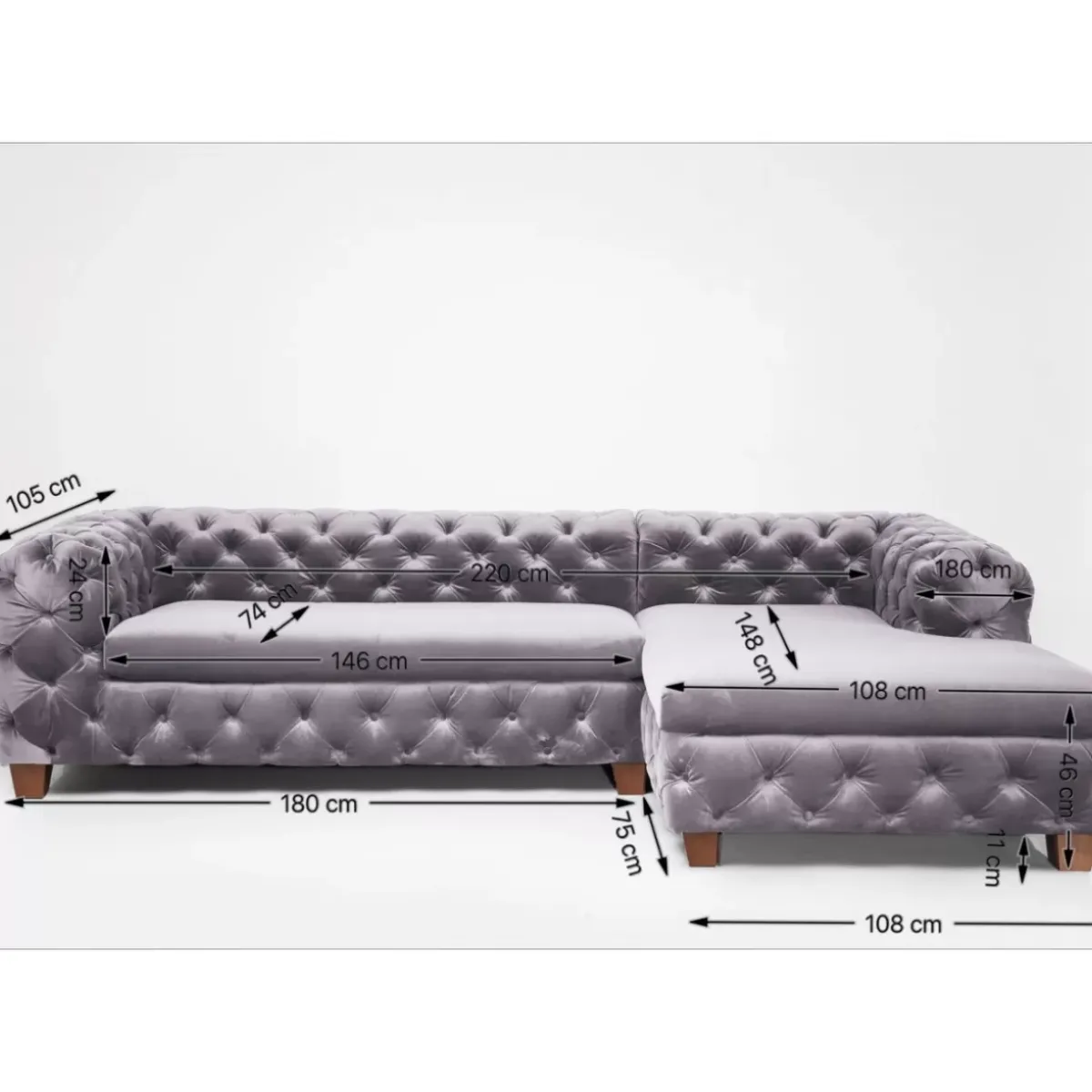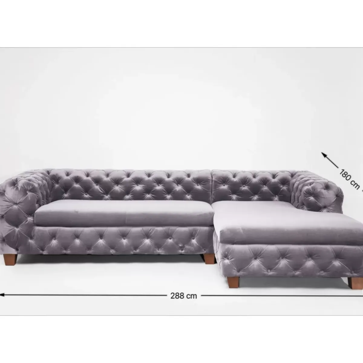 - Groses,Graues Ecksofa Im Chesterfield-Stil Mit Einem Samtig Schimmernden Bezug Und Schwarzen Fusen Aus Massivholz