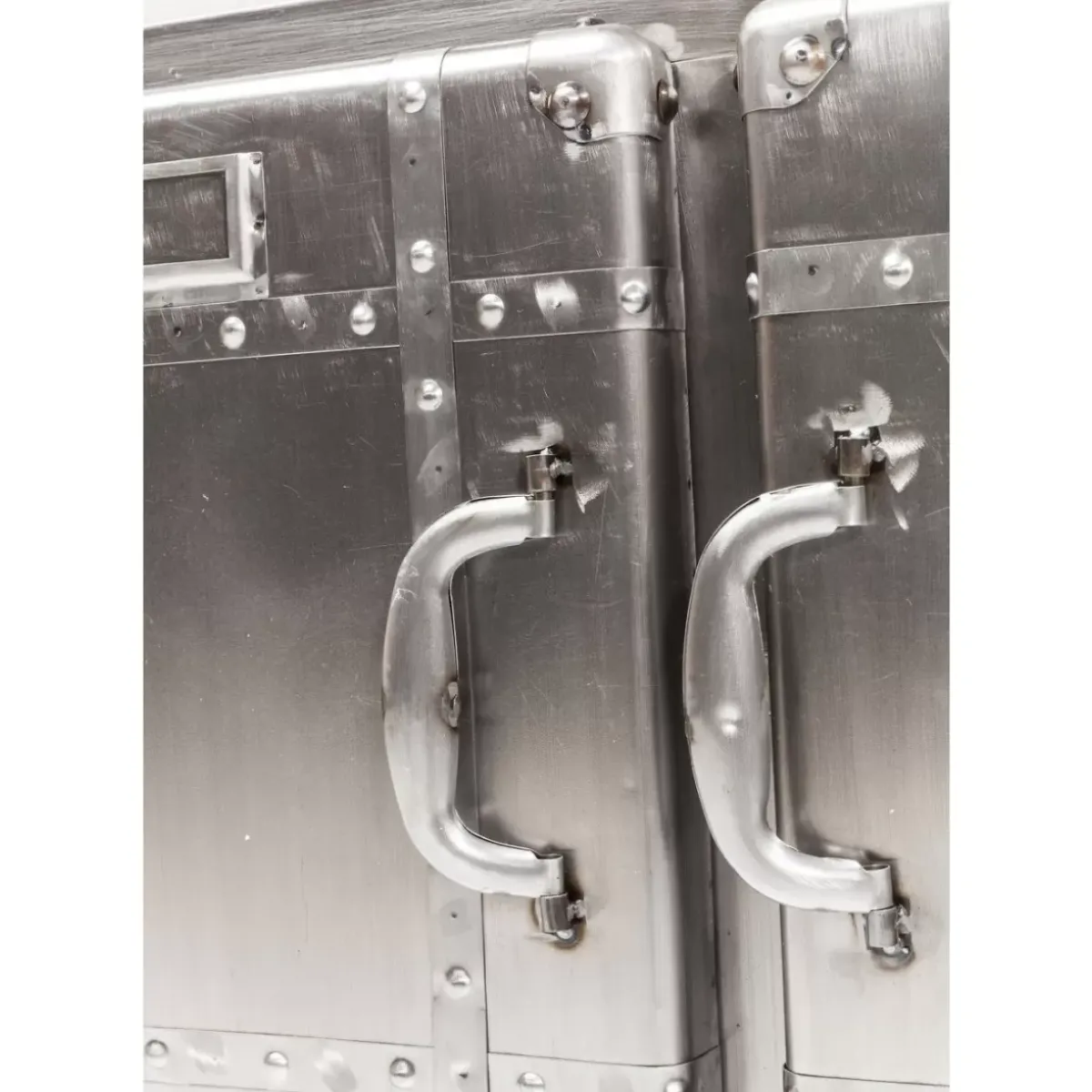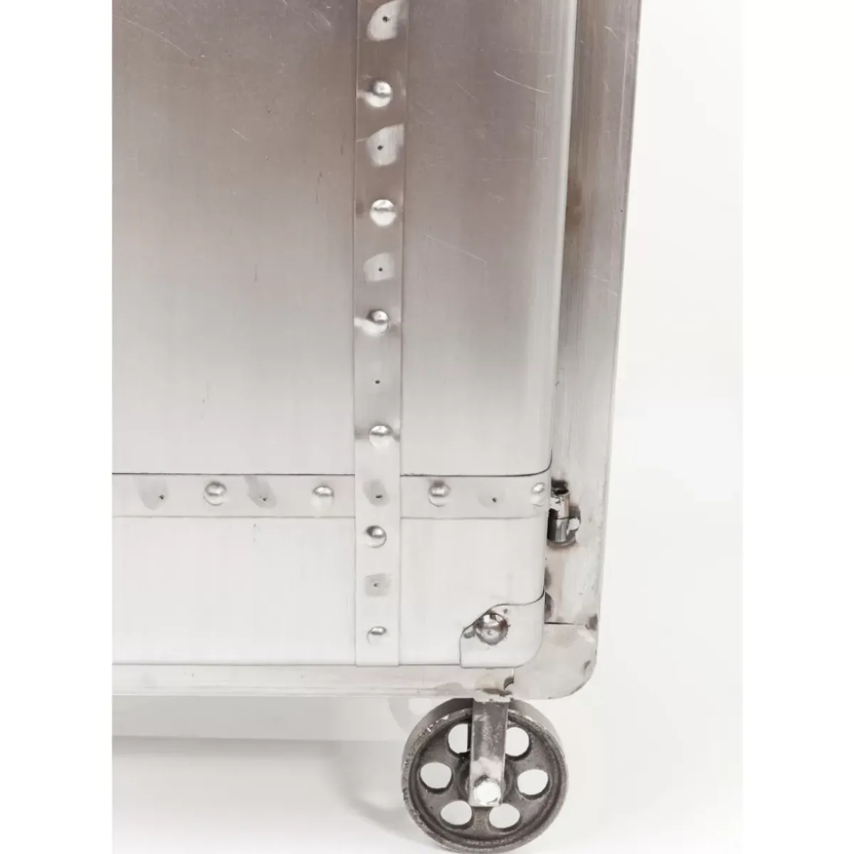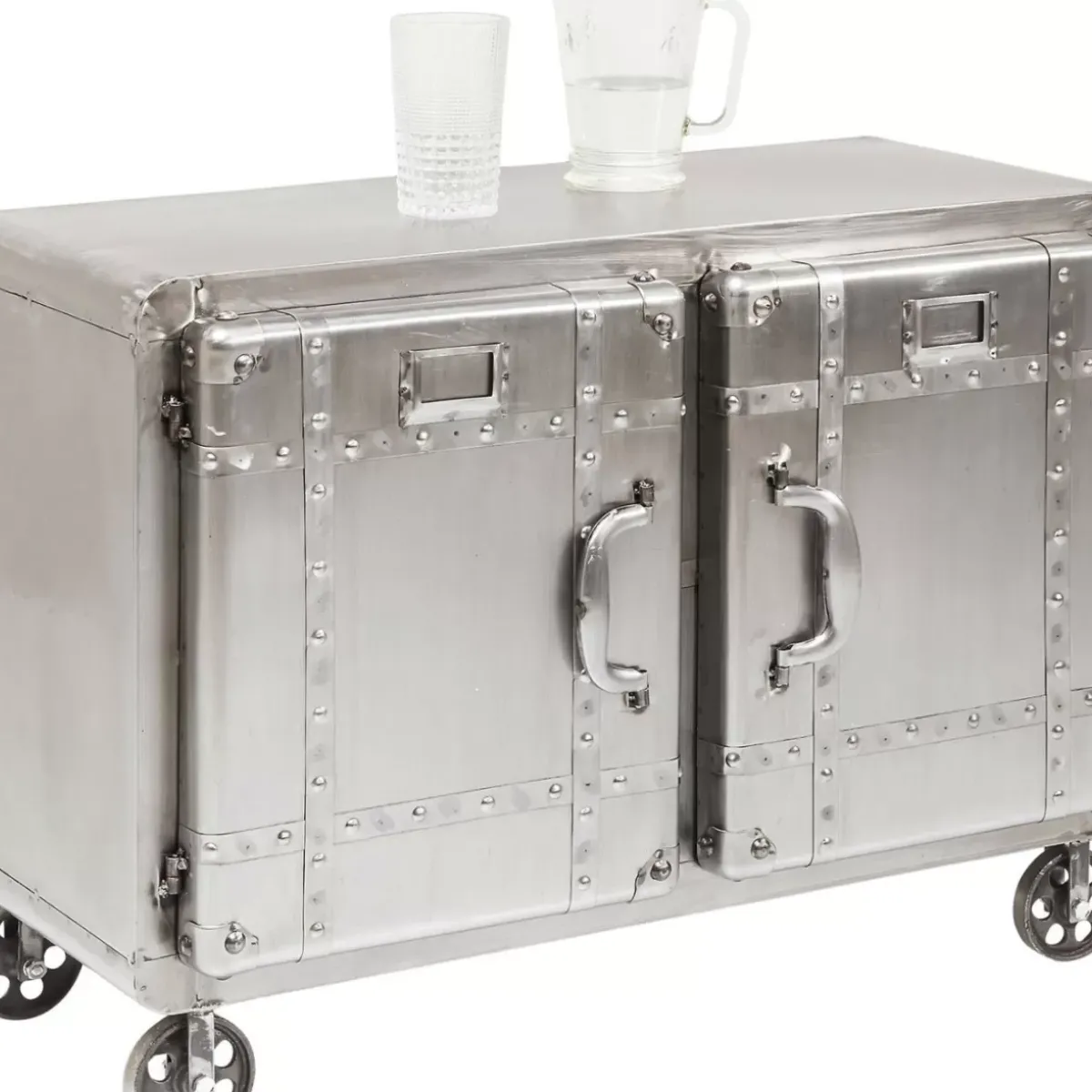 - Rechteckige,Kompakte Kommode Aus Stahl Im Vintage-Look Auf Vier Rollen Mit Schweisnahten Und Zwei Grosen Ablageflachen Hinter Den Beiden Turen