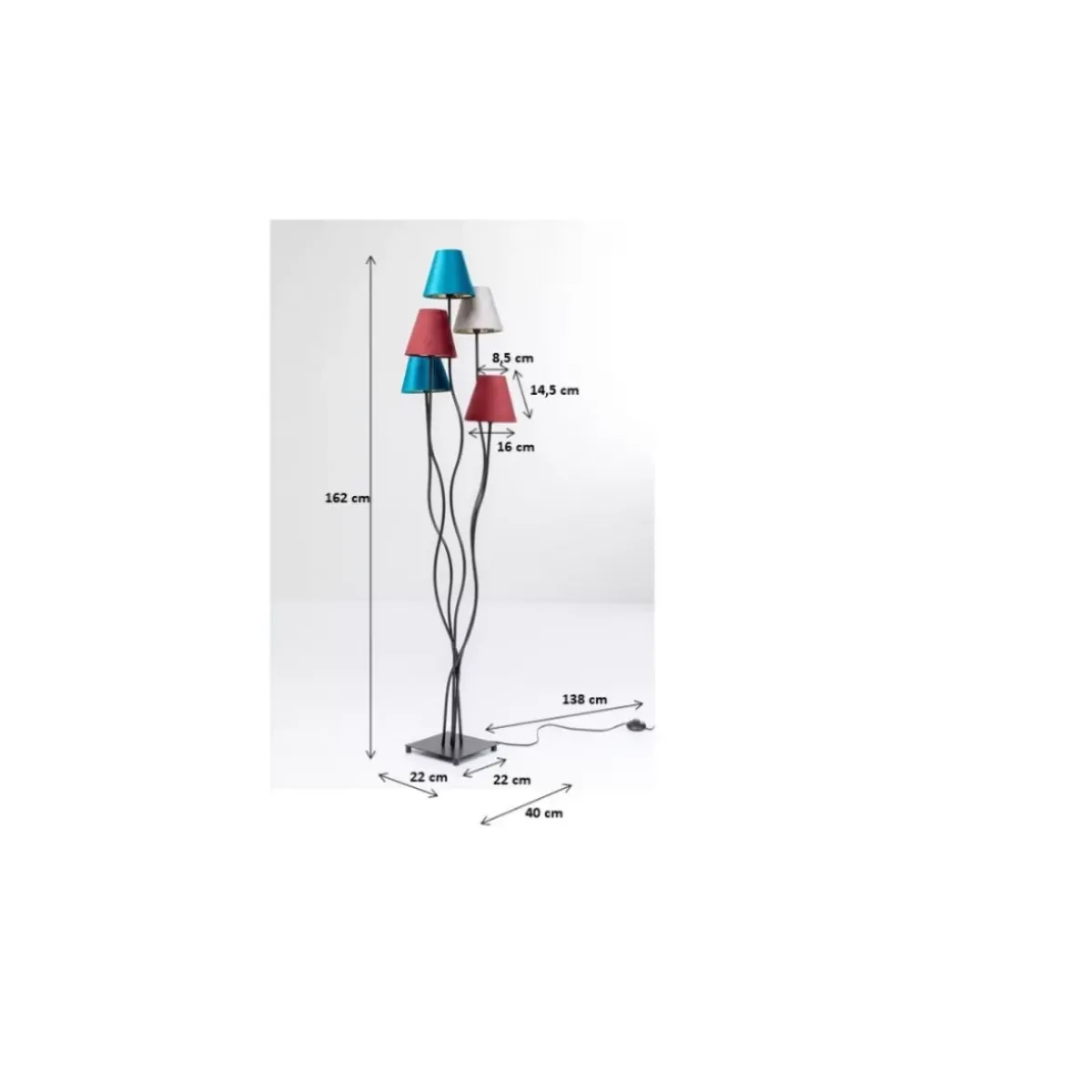 - Ausergewohnliche Stehleuchte Mit Funf Schirmen In Blau,Grau Und Rot,Die Sich Jeweils In Ein Hubsches Samtkleid Geworfen Haben